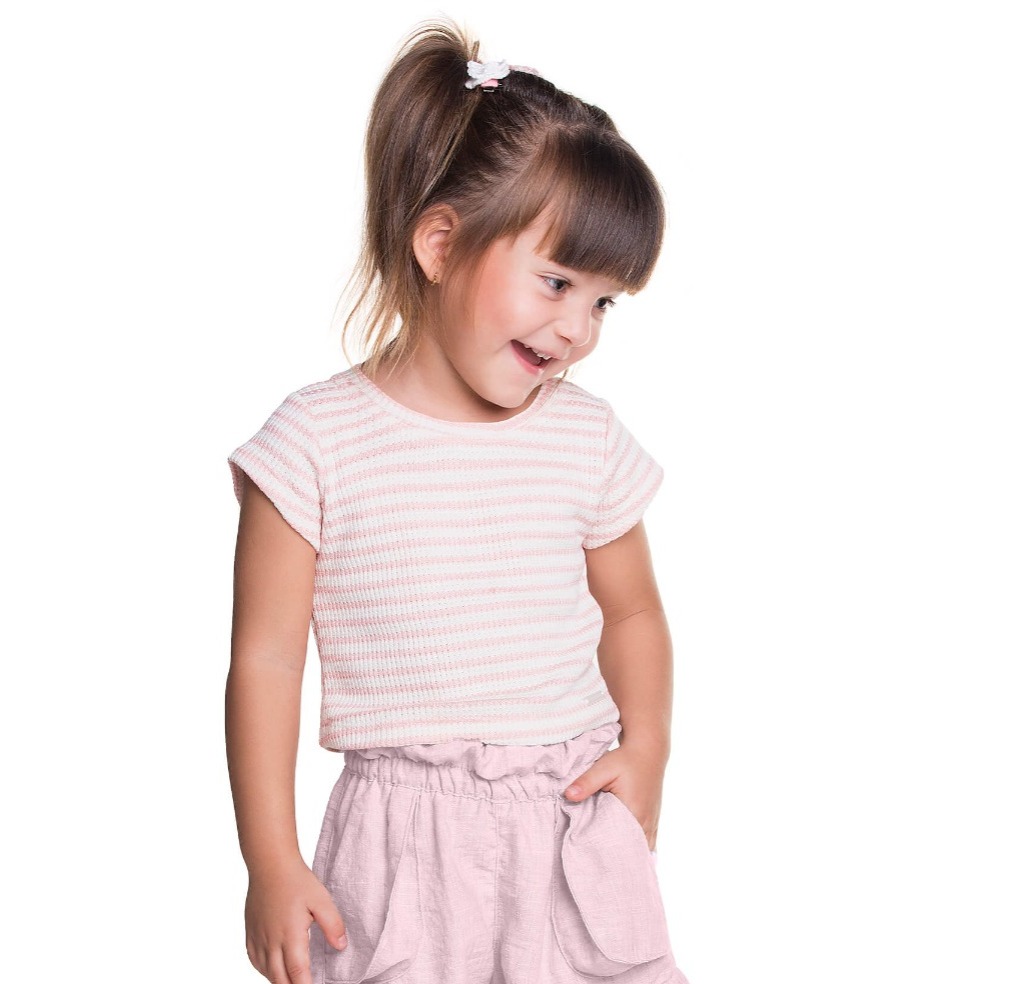 Blusa infantil da Have Fun, tricô de malha, rosa listrada, mangas curtas, gola redonda. Perfeita, arrumadinha, peça a sua!
