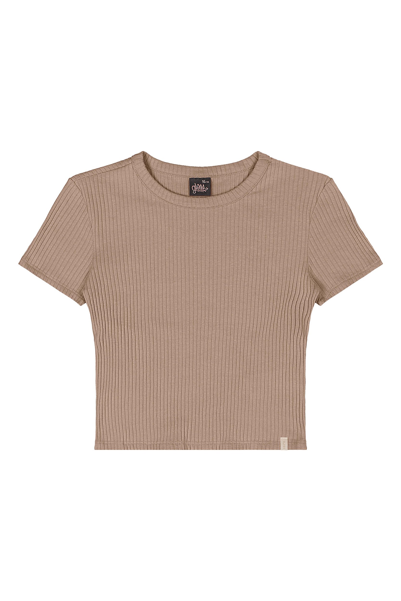 Blusa juvenil feminina da Gloss, duas cores, cru e bege, malha canelada, manga curta, gola redonda, modelo beija cós. Moderna, estilosa, peça logo o sua!