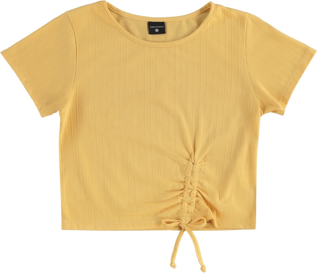 Blusa juvenil feminina da Dila, amarelo acerola, manga curta, modelo com franzido na lateral, comprimento normal. Bonita e com preço ótimo, compre já!