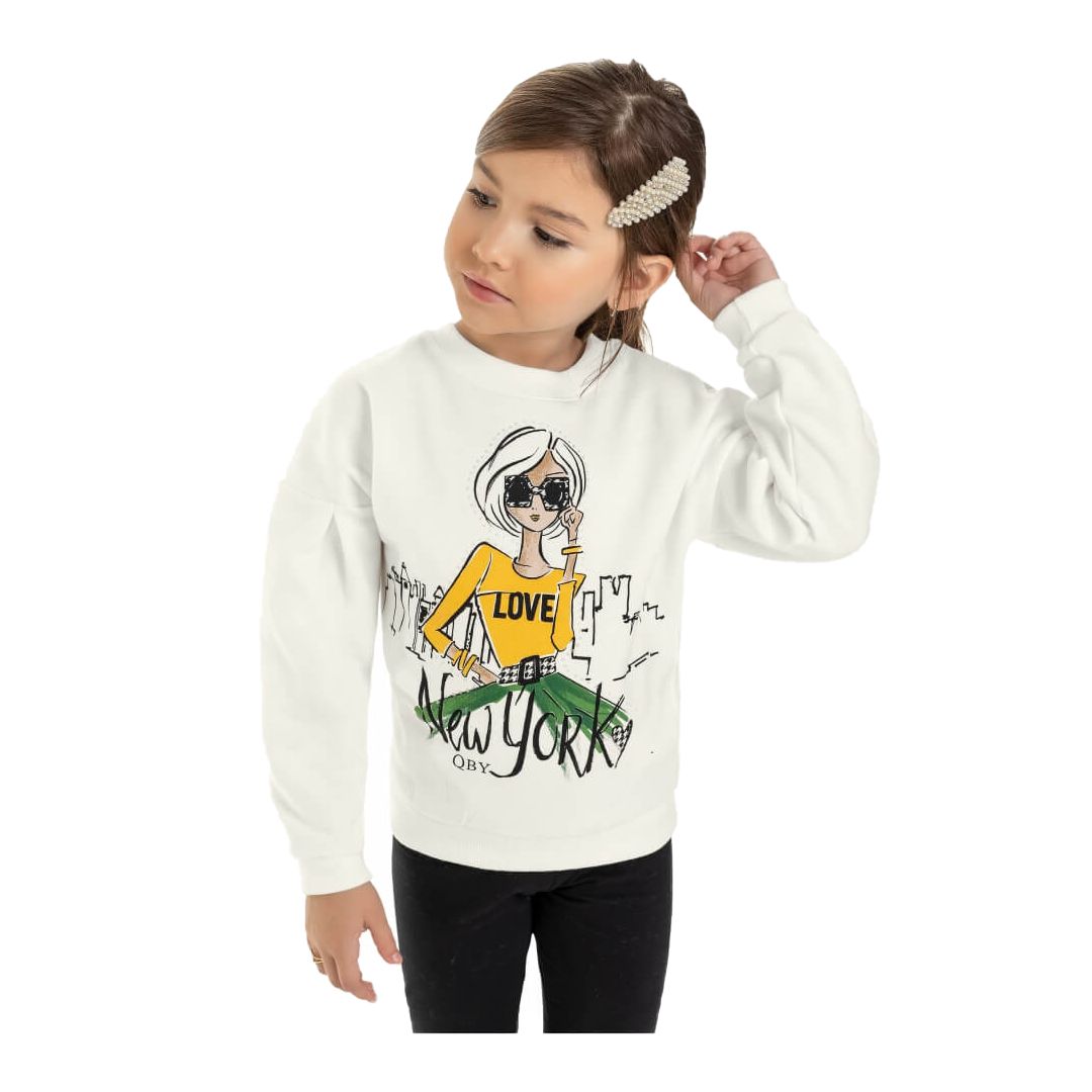 Blusão infantil da Quimby, tecido moletom com felpa na cor branca com uma estampa divertida de uma girl e palavras em inglês, punho da mesma cor na gola, mangas e barra. Blusa quentinha e confortável para completar aquele look.