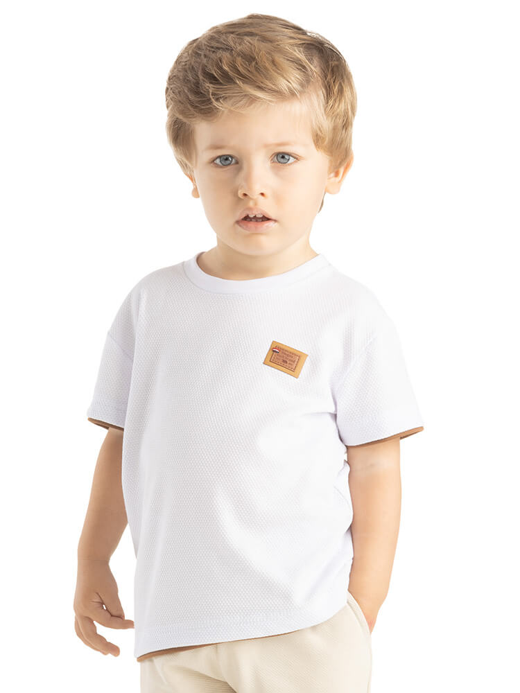 Apresentamos a camiseta infantil masculina Biogas, branca com detalhes bege na barra e mangas. Esta camiseta é arrumada e oferece conforto e estilo para os pequenos. Ideal para manter a criança fresca e elegante em ocasiões casuais ou eventos formais. O tecido em malha favo proporciona uma textura leve e respirável, perfeita para climas quentes. As mangas curtas completam o design funcional e moderno.