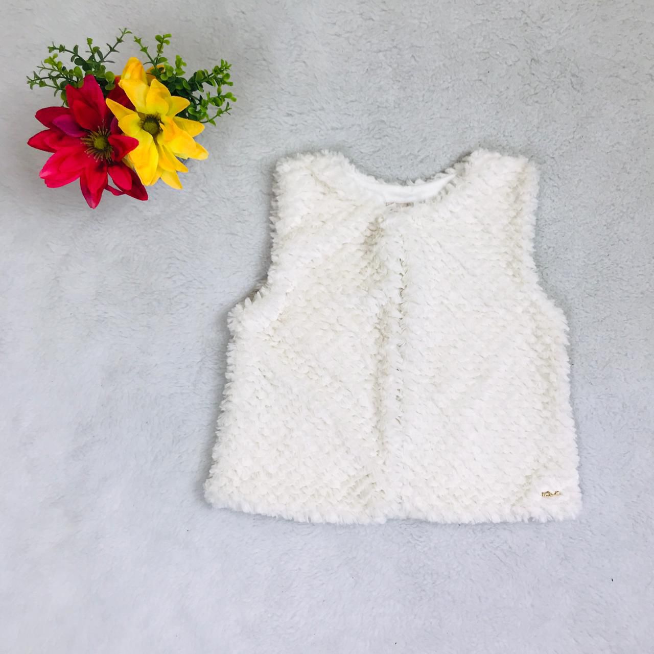 Colete infantil feminino da Nini Bambini, em pelinhos, na cor bege, sem mangas, com fechamento de um botão na frente. Super quentinho e estiloso.