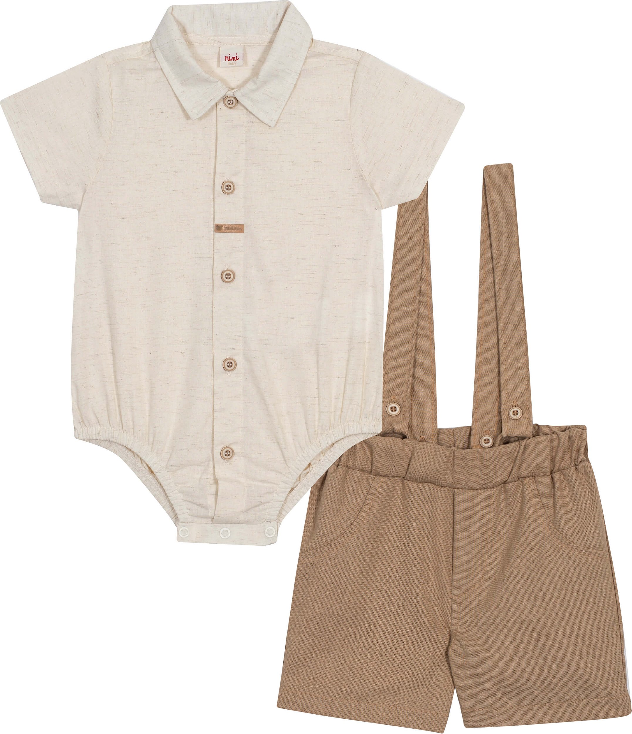 Conjunto de bebê masculino da Nini Bambini, camisa body, cru social, mangas curtas, shorts bege com suspensório, elástico na cintura, bolsos na frente. Super estiloso, moderno, batismo, pajem, compre agora!