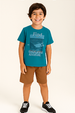 Conjunto infantil e juvenil masculino da Bee Loop, azul petróleo, mangas curtas, bermuda em moletom sem felpa, marrom, elástico na cintura. Perfeito, moderno, confortável, fresquinho, peça o seu!