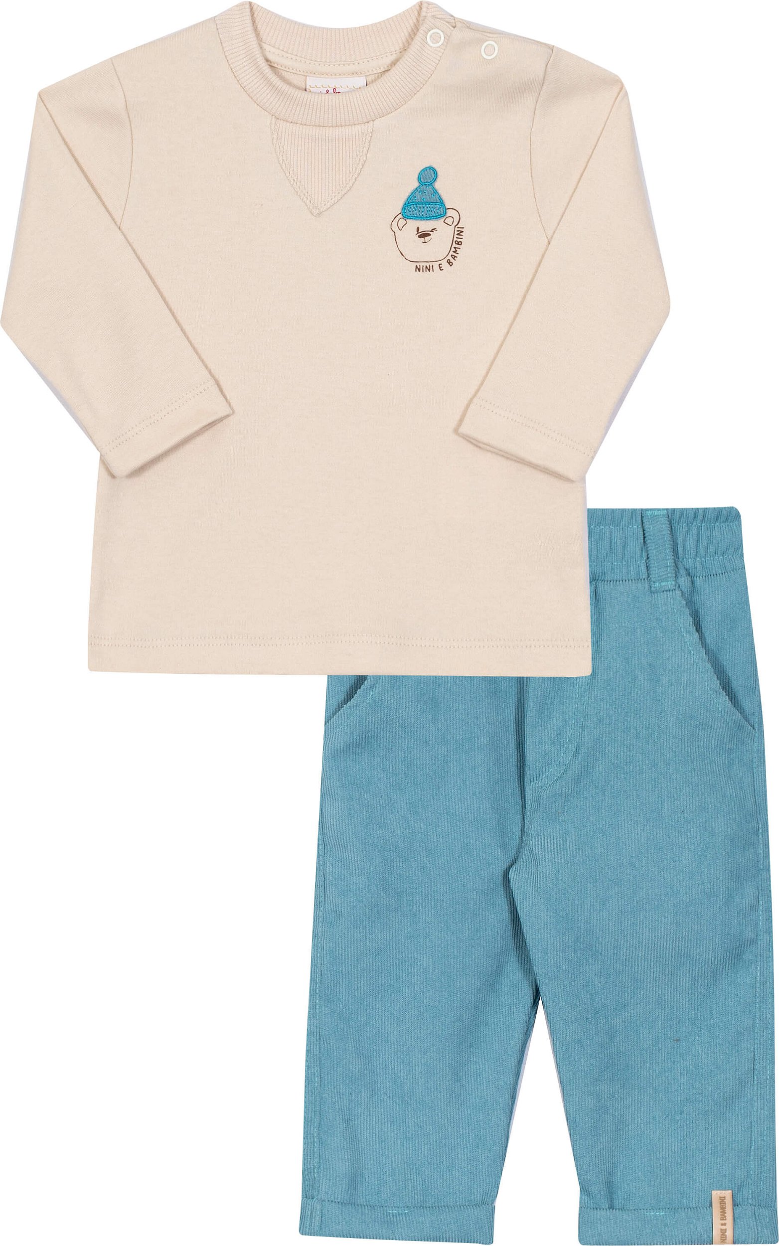 Conjunto de bebê e infantil masculino da Nini Bambini, camiseta bege, estampa com urso, gola redonda, calça de veludo cotelê, azul tiffany, elástico na cintura, bolsos na frente, barra dobrada. Venha e já peça o seu!
