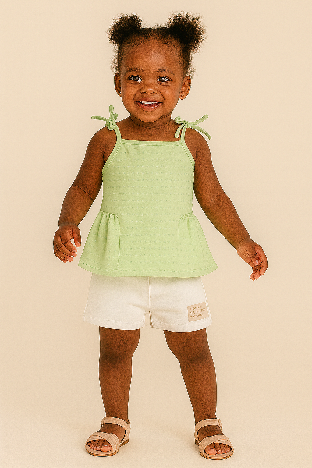 O conjunto infantil feminino Dila oferece conforto e estilo para os dias quentes. Composto por uma batinha com alças e shorts, disponíveis nas combinações verde com branco e vermelho com cru, é feito com tecido leve e fresquinho o shorts permite liberdade de movimento com elástico na cintura.