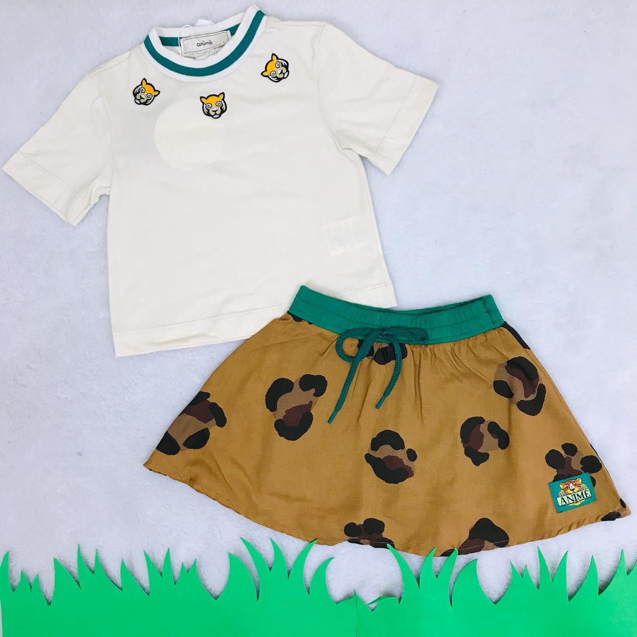 Conjunto infantil feminino da Animê, blusa cropped bege, manga curta, com estampa de leão, saia shorts marrom, com estampa de animal print. Compre já!
