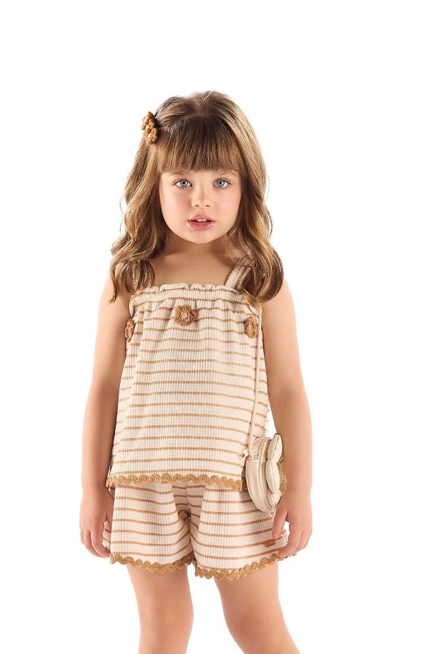 Conjunto infantil feminino da Up Baby, bege, malha maquinetada, alça, cianinha na barra, shorts mesma cor e tecido, elástico na cintura. Perfeito, moderno, fresquinho, estiloso, peça já!