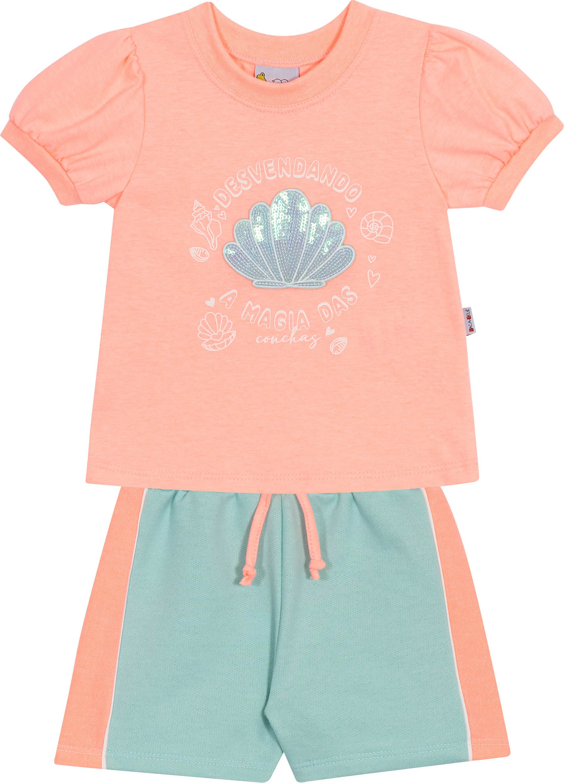 Conjunto infantil feminino da Nini Bambini, blusa salmão, bordada com uma concha, mangas curta, short, moletinho, tiffany com salmão, elástico na cintura. Perfeito, colorido, divertido, fresquinho, peça já!