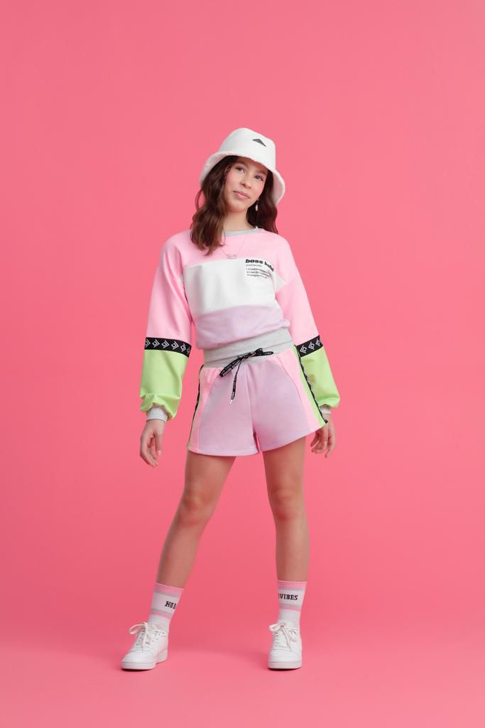 Conjunto infantil feminino da Vanilla Cream, blusa decote redondo, mangas longas com detalhes de faixa em sobreposição, arrematas ribana cinza manga dupla sanfonada: decotes, punho e barra. Destaque para frente com estampa escritas, na faixa branca. Shorts cós largo com elástico, faixa para amarração, detalhes para as laterais com sobreposição faixa bordada, assim como nas mangas. Compre agora!