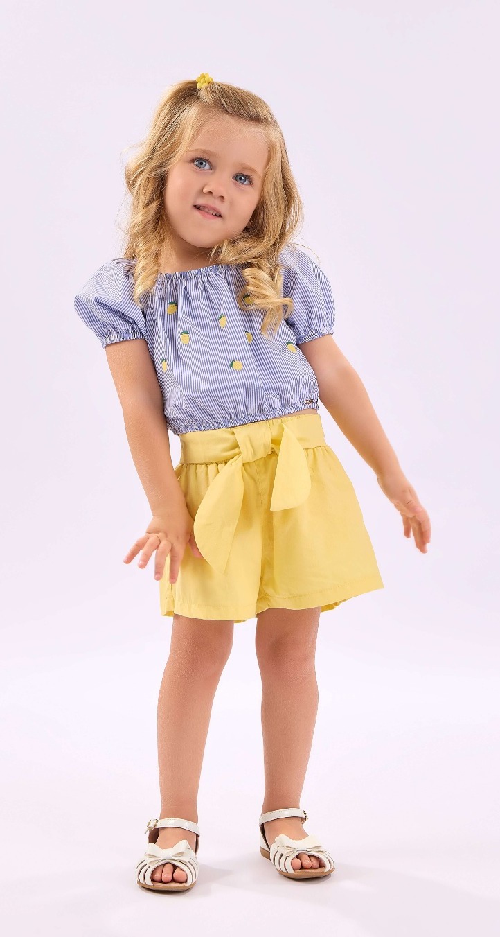 Conjunto infantil feminino da Nini Bambini, blusa listrada azul, bordada com limões, mangas fofas, shorts, amarelo, elástico com laço na cintura. Perfeito, colorido, divertido, fresquinho, peça já!