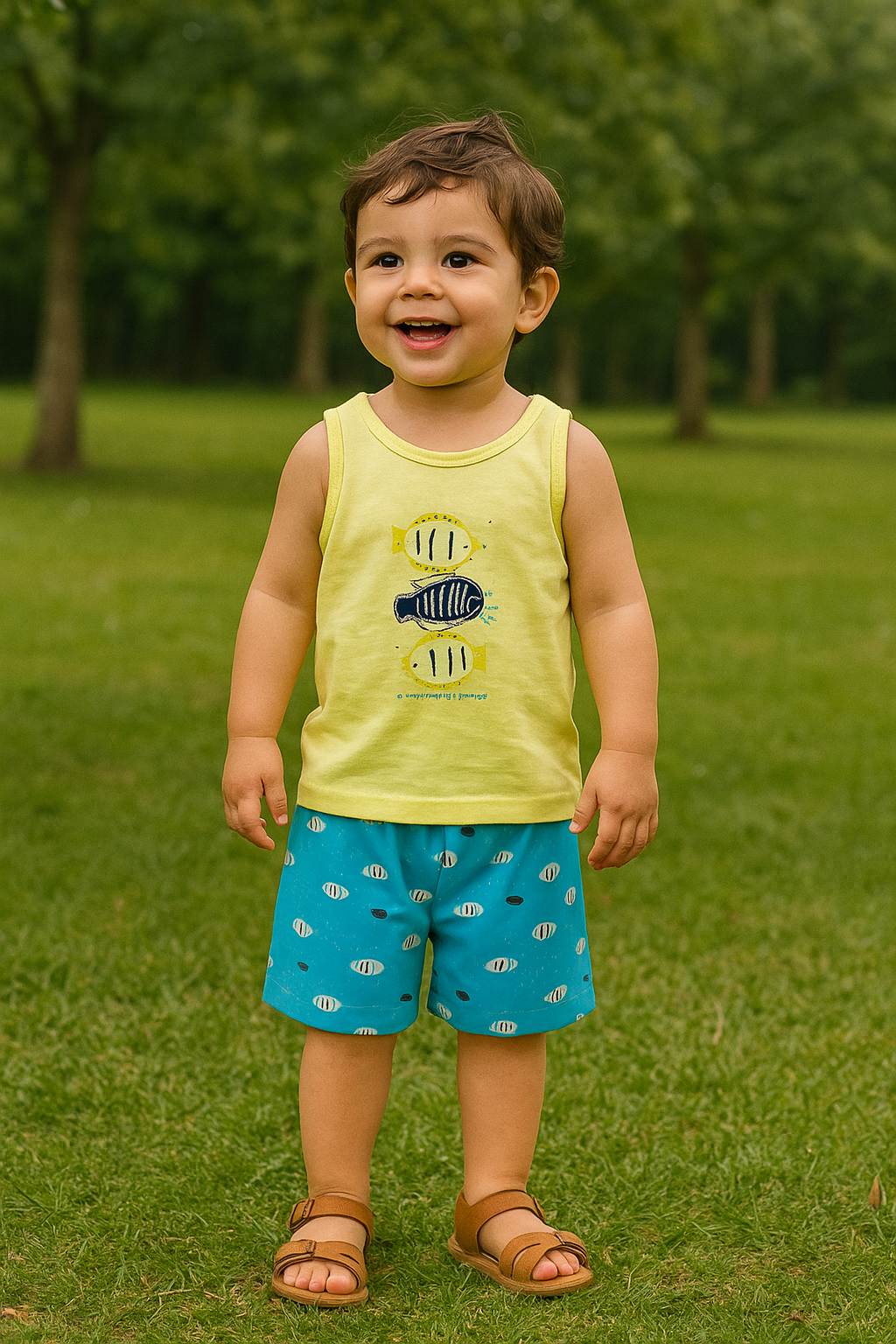 Conjunto infantil masculino da Nini Bambini, regata verde, sem mangas, estampa peixes, bermuda tactel, azul estampa peixinhos, elástico na cintura. Bonito, confortável e precinho bom, peça o seu aqui!