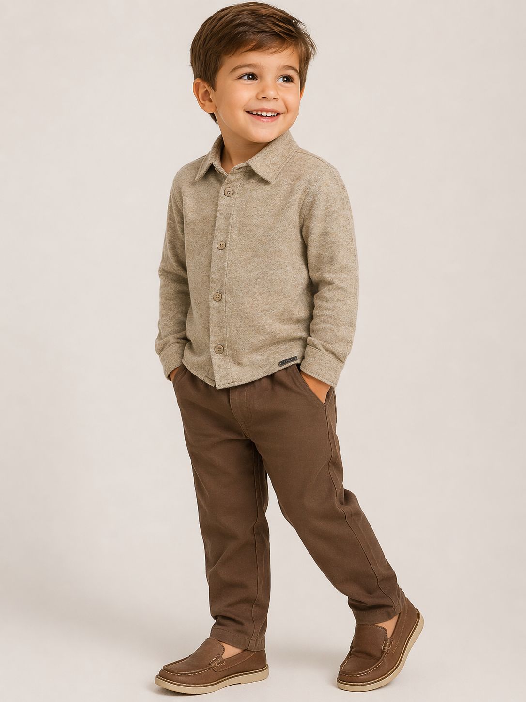 O conjunto infantil masculino Dila traz camisa social bege e calça em sarja marrom, ideal para ocasiões arrumadinhas e com estilo.