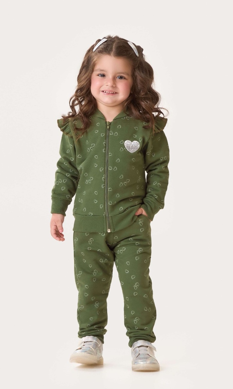 O conjunto é feito em moletom felpado, garantindo maciez e aquecimento para a criança. O blusão possui fechamento frontal com zíper, facilitando o vestir e tirar. A calça tem modelagem confortável para liberdade de movimentos, ideal para brincar e usar no dia a dia.