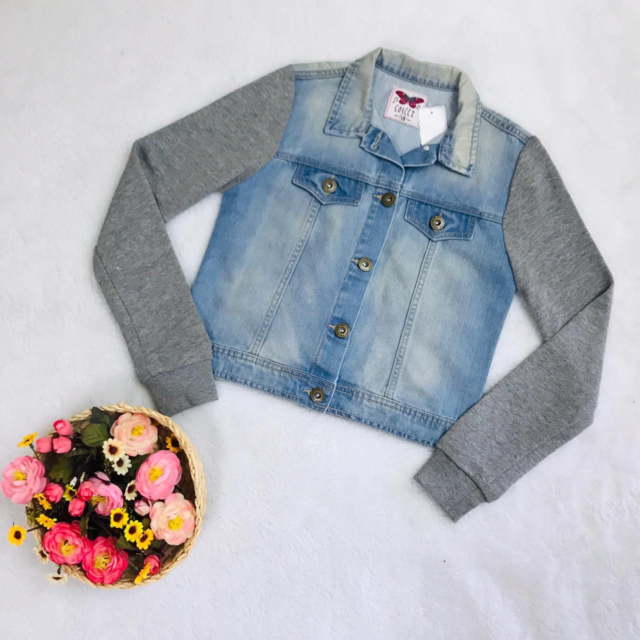 Jaqueta infantil feminina da Colcci, lavagem jeans clara, mangas na cor mescla em moletom com punho, fechamento em botões na frontal, gola. Super estilosa, compre agora!