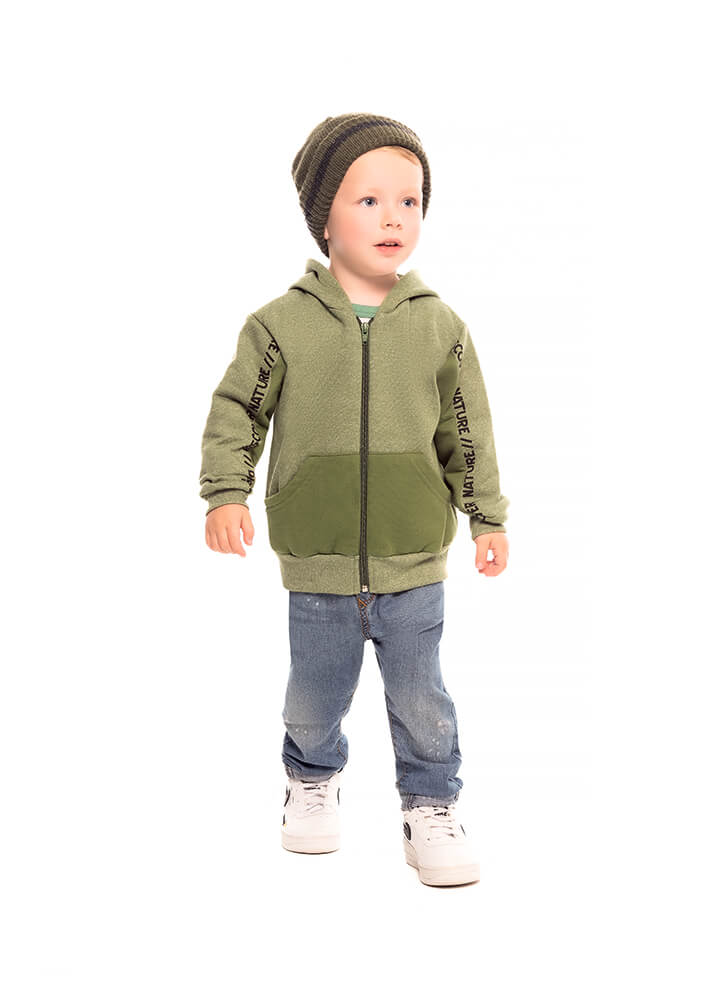 Jaqueta infantil masculina da Dila, moletom flanelado, verde pesto, aberta, faixa com escrita nas mangas, zíper, capuz, bolso na frente em verde mais escuro, punho na manga e barra. Compre já.