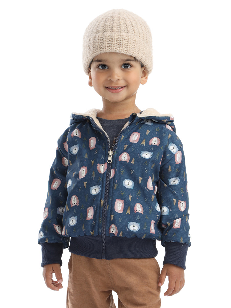Jaqueta infantil com tecido de microfibra azul estampada e parte interna em pele sintética macia e quentinha. Ideal para proteger do frio com estilo e conforto.