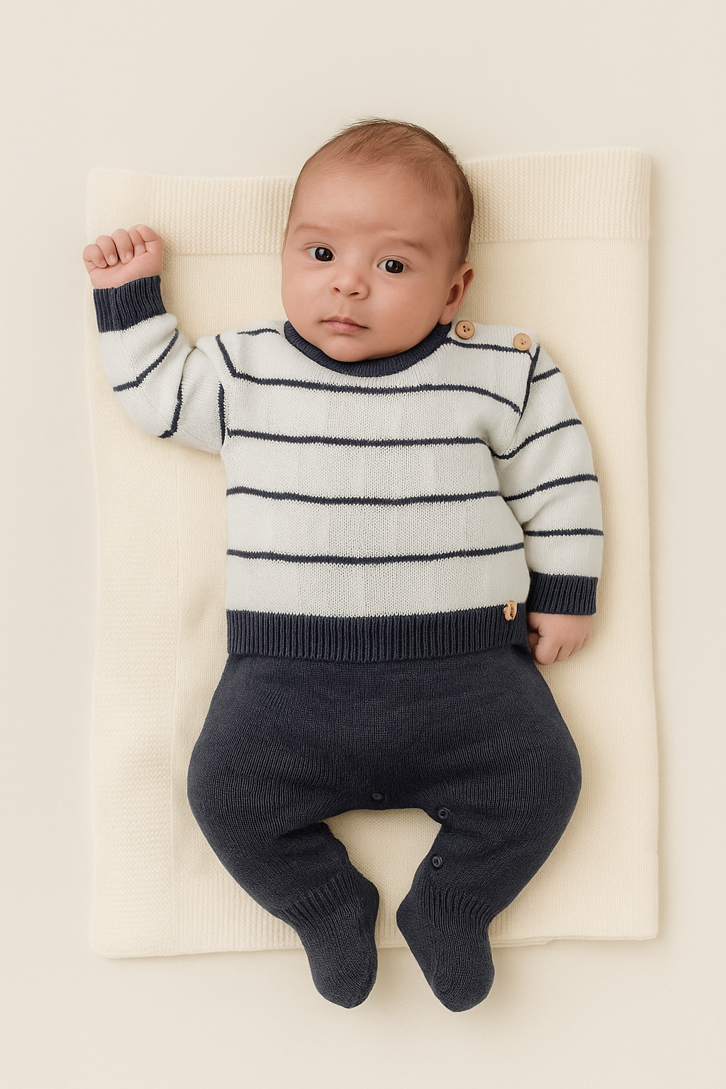 Kit maternidade masculino da Noruega, tricô, 2 cor, listrado com verde e azul, tricô, mangas longas com pé, abertura com botões lateral e nas pernas, acompanha manta 90x80 cm. Perfeito, macio, peça o seu!