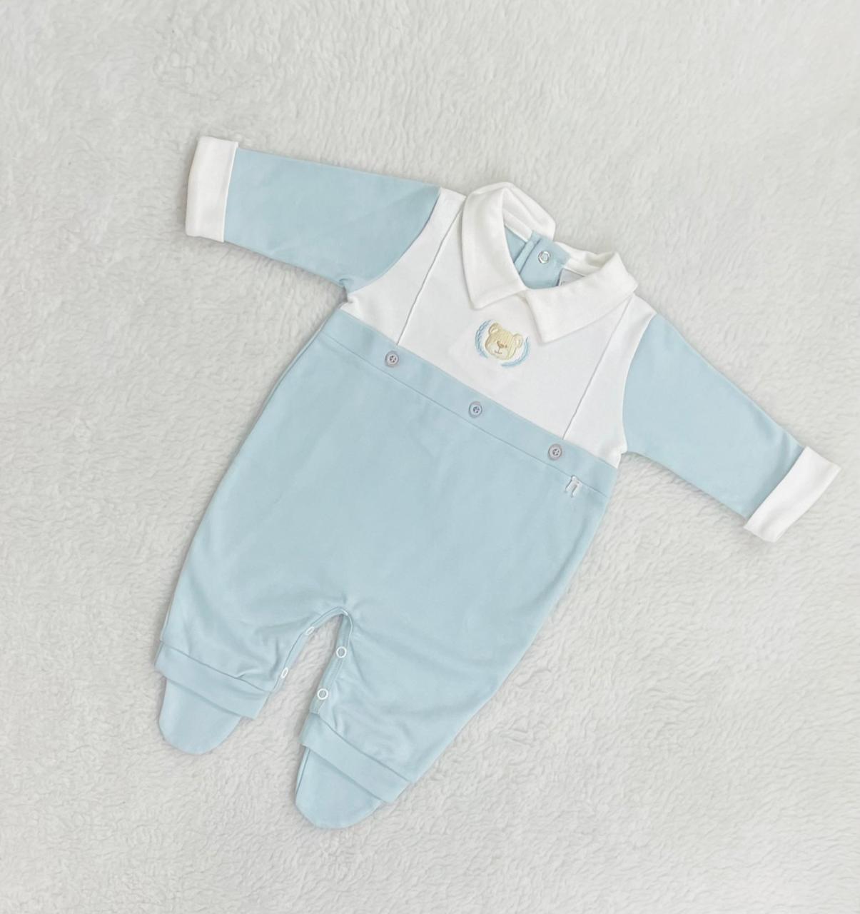 Macacão de bebê Noruega feito em malha de algodão, garantindo conforto e maciez para a pele sensível do bebê. Conta com punhos nas mangas para melhor ajuste e golinha estilo polo, que adiciona charme ao modelo. Possui bordado frontal com ursinho, trazendo um detalhe delicado e carinhoso. A abertura atrás e entre pernas facilita a troca, e o pezinho protege os pés, mantendo-os sempre aquecidos.