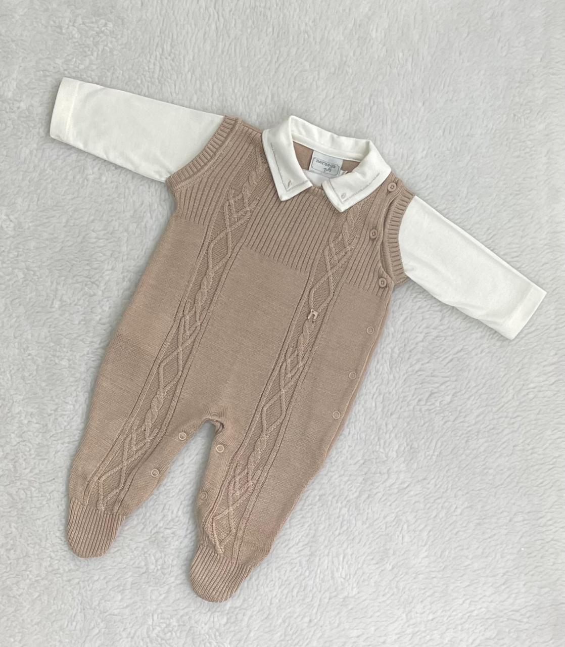 Produto disponível nas cores bege e azul. O tricô garante aquecimento, enquanto o suedine nas mangas evita incômodos, tornando o uso prático e confortável para o bebê.
