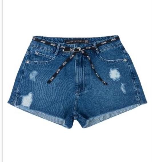Shorts jeans juvenil Authoria, lavagem Azul, modelo destroide, bolsos na frente e atrás, barra desfiada, fita preta na cintura. Moderno e estiloso, peça já