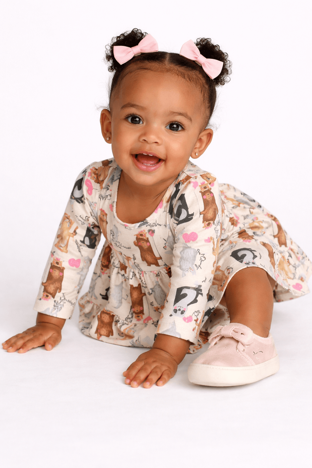 Confeccionado em malha de algodão com toque macio, o vestido é leve e possui manga longa para proteger sem esquentar demais. A gola redonda é confortável e fácil de vestir, enquanto o babado na barra dá um acabamento delicado e feminino. O tecido permite que o bebê se movimente com naturalidade.