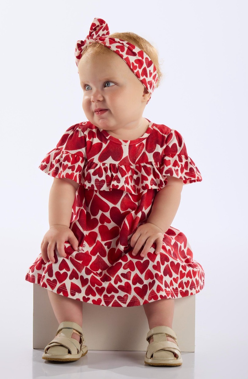 Vestido de Bebê da Up Baby, cru com corações vermelhos, modelo rodado, babado que viram mangas, gola redonda, acompanha a faixa. Perfeito, fresquinho, bom para o natal, peça o seu!