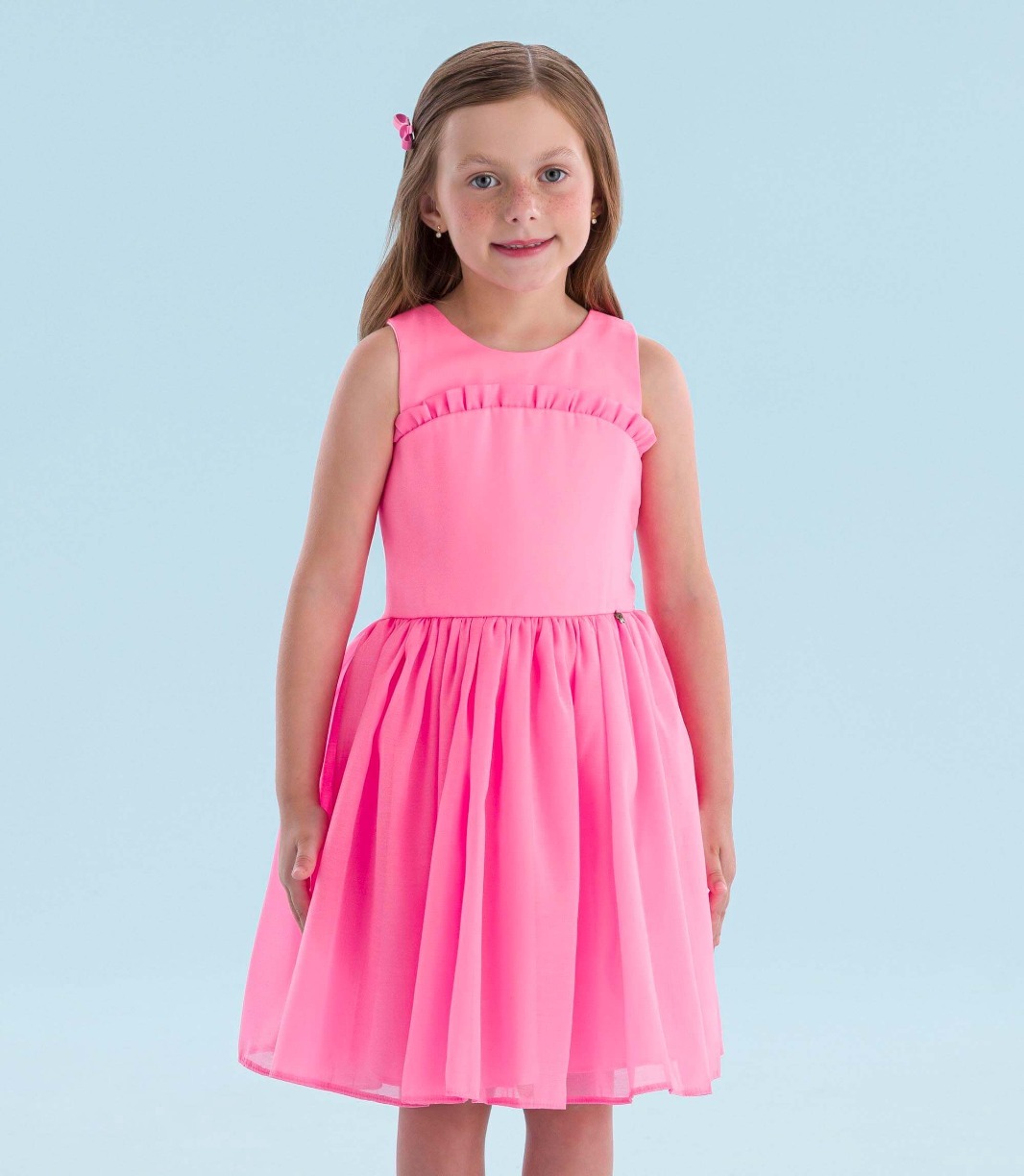 Vestido infantil da Mon Sucré, organza forrado, pink neon, sem mangas, babado em cima, franzido na cintura. Perfeito para as festinhas, moderno, compre o seu!
