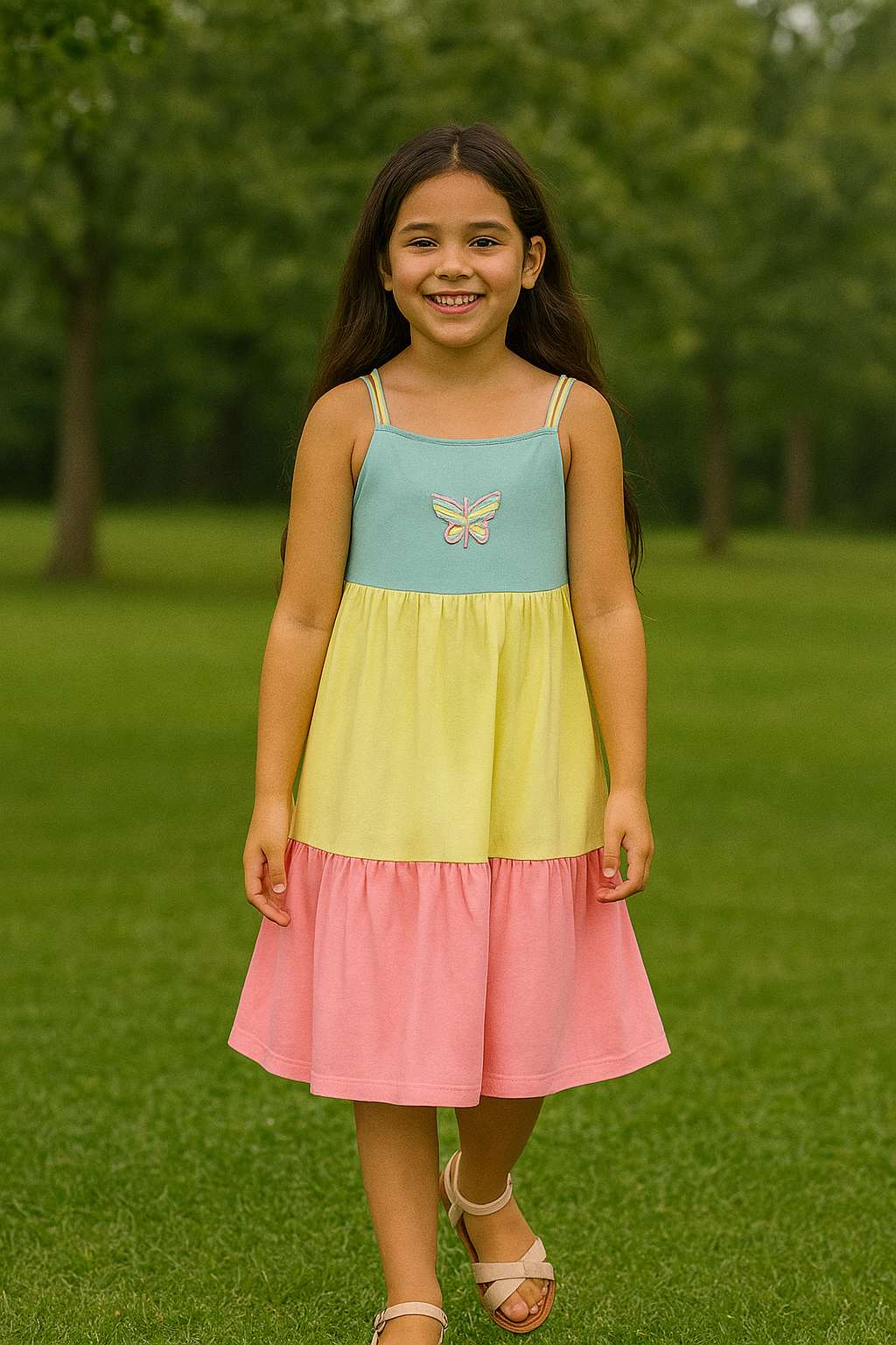 Vestido de bebê e infantil da Nini Bambini, faixas largas em três cores, malha de algodão, modelo rodado. Fresquinho, perfeito, social, peça já!