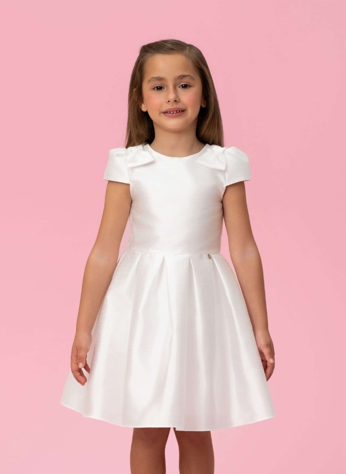 O vestido infantil Mon Sucré é confeccionado em tecido xantung branco, ideal para ocasiões especiais como batismos e daminhas. Ele possui mangas delicadas, laços decorativos nos ombros e uma leve prega na cintura que valoriza o caimento da peça.