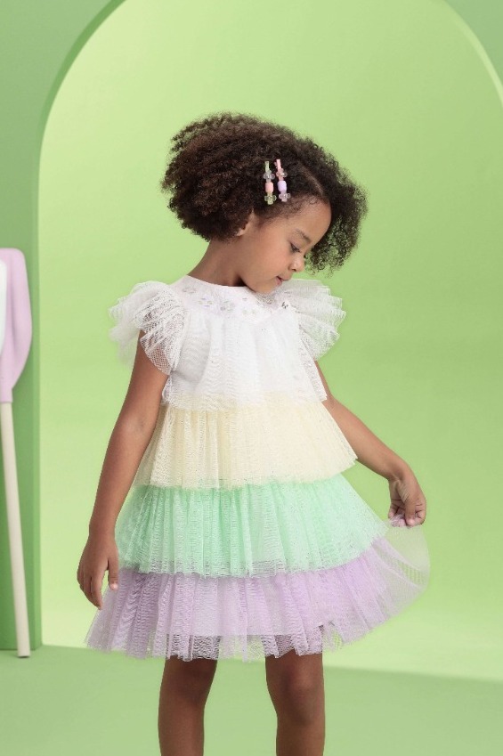 Vestido infantil de festa da Petit Cherie, linha conceito, camadas de tule coloridos, amarelo, verde e lilás, mangas em tule, modelo solto, com forro para maior conforto. Perfeito, peça já o seu!
