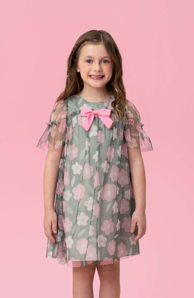 Confeccionado com tecido leve e macio, fácil de vestir e adequado para a pele sensível das crianças. O tom verde musgo com detalhes em rosa formam uma combinação suave e elegante. O vestido é perfeito para ocasiões que exigem uma roupa especial, sem abrir mão do conforto e estilo.